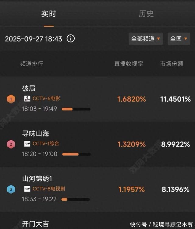 9月27日18:20开播的《寻味山海》以贵阳篇火爆启幕,直播收视率即达1.32%,市场份额占比8.99%,截至19:00节目收官时,该片在央视同时段所有频道中高居收视第二位。